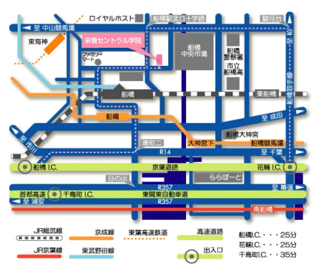 ● 東京方面から(首都高速7号線経由) 京葉道路船橋ICから約10分